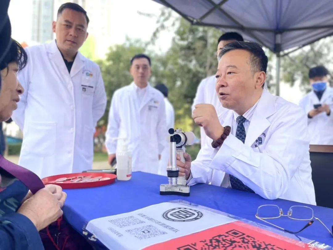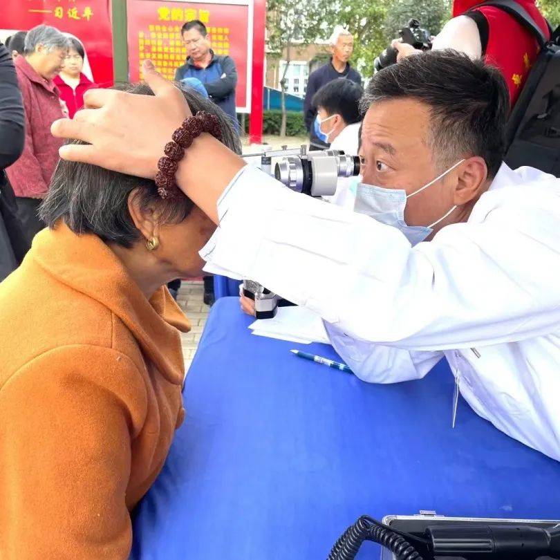 郑州卓美眼耳鼻喉医院业务院长王新主任为居民做眼部检查,耐心解答居民问诊。
